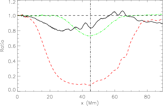 Figure 21: Acoustic power absorption by the simulated sunspots. The green dash-dotted, black solid and red dashed curves correspond to the case A, case B, and case C magnetic field configurations, respectively. Horizontal dashed line represents the power ratio 1. Vertical dash-dotted line shows the axis of the magnetic configuration. |
