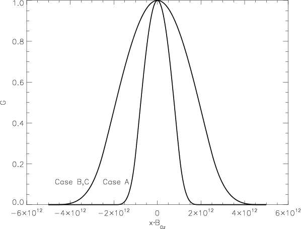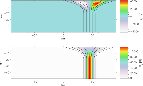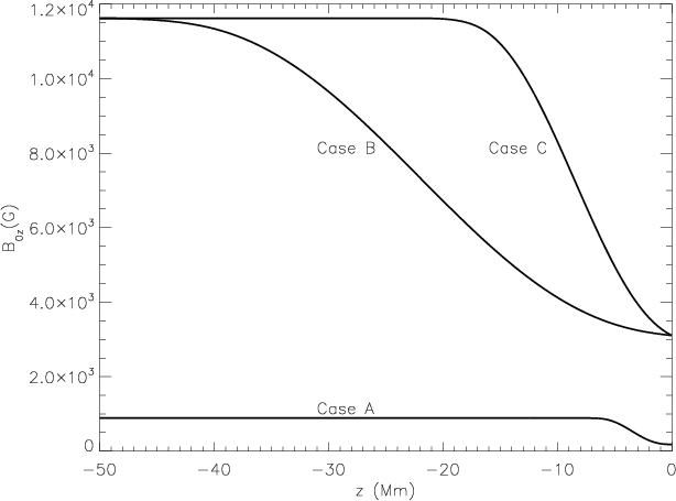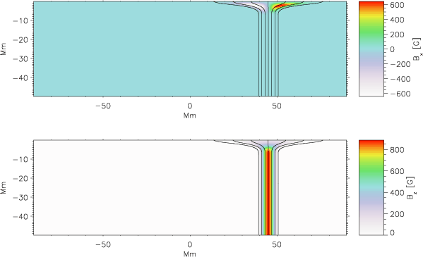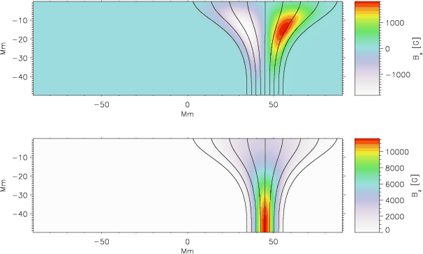 where B0z describes the decrease in the vertical component of magnetic field towards the top of the model, and G is the function defining how the magnetic field opens up with height. The magnetic field constructed in this way is divergence-free by definition. The equilibrium background gas pressure and density are then recalculated using the magnetohydrostatic equilibrium condition in Eq. (1). If the magnetic field