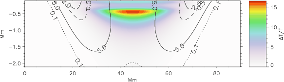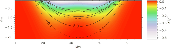 The curvature of the magnetic field changes the temperature stratification in the domain. For the first case of the weak magnetic field (Case A, Fig. 4), the temperature change is rather small (Fig. 7). Below the temperature decrease, caused by the sharp decline of the kinetic pressure in the region where the magnetic field is nearly vertical, a temperature increase is noticeable. This increase is caused by the pressure rise needed to compensate for the increase in magnetic tension.