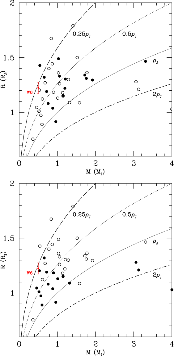 and the metal deficiency of its host star seem to strengthen the existence of a correlation between the heavy-element content of giant planets and the stellar metallicity (Guillot et al. 2006; Burrows et al. 2007). Still, this proposed correlation is not obvious at all in a planetary mass-radius diagram presenting separately the planets for which the host star has a sub-solar metallicity (see Fig. 8, top panel): both populations seem well mixed without any hint of a smaller density for planets orbiting around metal-poor stars. On the other side, the division of transiting planets into two well separated groups in the mass-radius diagram seems clearer when the level of irradiation is considered (Fig. 8, bottom panel). This apparent correlation density-irradiation does not necessarily indicate a direct influence of the incoming stellar flux on the planet size, it could also be explained by a more indirect action. For instance, the most irradiated planets are the ones being the closest to their host star, so the ones for which tidal heating should be the largest.