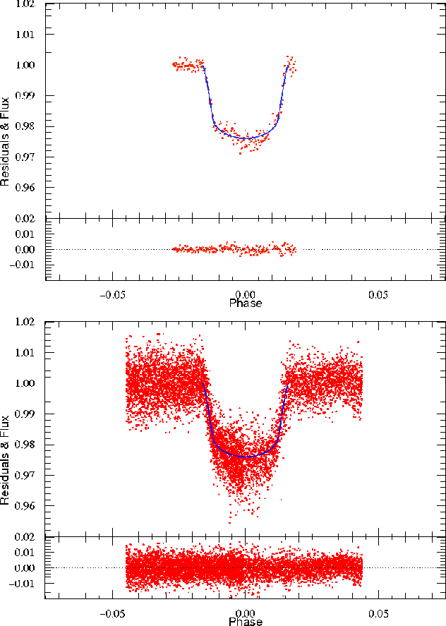 Figure 2: FTS i'-band (top) and LT/RISE V+R (bottom) transit photometry for WASP-6 and residuals after subtraction of the best-fit transit curve (superimposed in blue). |