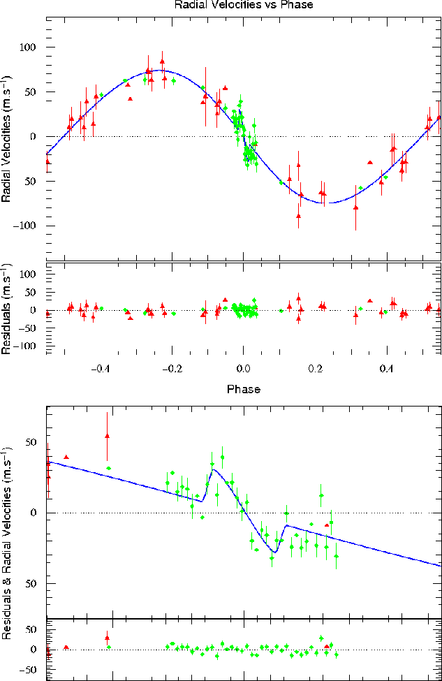 Figure 3: Top: the RV measurements of WASP-6 obtained with CORALIE (red triangles) and HARPS (green squares). The systematic velocity has been subtracted. The solid line is the MCMC solution (see Sect. 4); it includes the RM effect. Bottom: zoom on the transit phase showing the RM effect. |