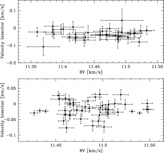 Figure 4: Bisector versus RV measured from all the observed CORALIE ( top) and HARPS ( bottom) spectra. We adopt uncertainties of twice the RV uncertainty for all bisector measurements. There is no correlation between these two parameters indicating the RV variations are not caused by stellar activity or line-of-sight binarity. |