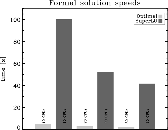 In Fig. 5, the time and memory consumption comparison for the different solvers is shown for the formal solution along the longest characteristic in the atmosphere. This allows a more direct comparison of the solutions. The speed advantage of the optimal solution is again obvious. The memory footprint of the optimal solution is also less than half as large as for SuperLU.
