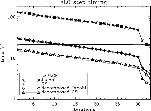 The serial GS and the parallelised Jacobi solver have similar speeds in the given example. For the first iterations, they are slower but after about one third of the iterations they become faster than the LAPACK solver. This results in an better overall superior performance for the complete ALI.