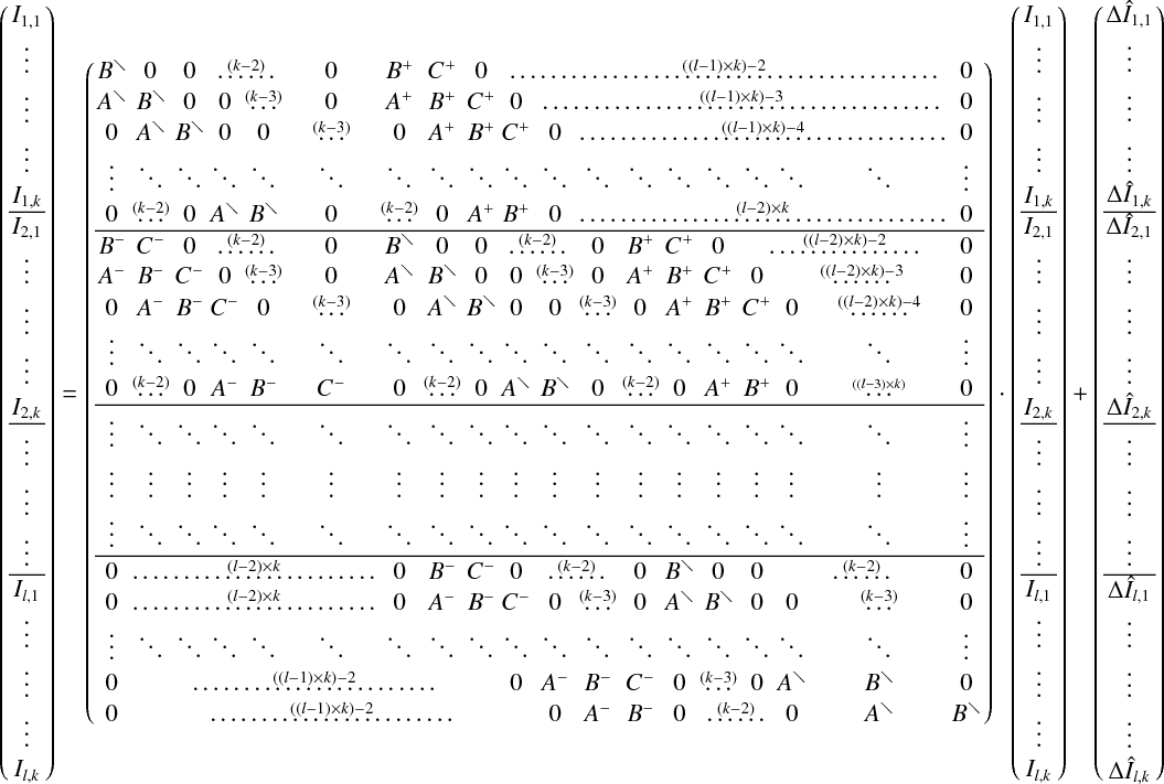 Figure 1: Explicit matrix form of the formal solution for a characteristic of length k and l wavelength points. The horizontal lines mark block borders of different wavelengths to clarify the structure.
