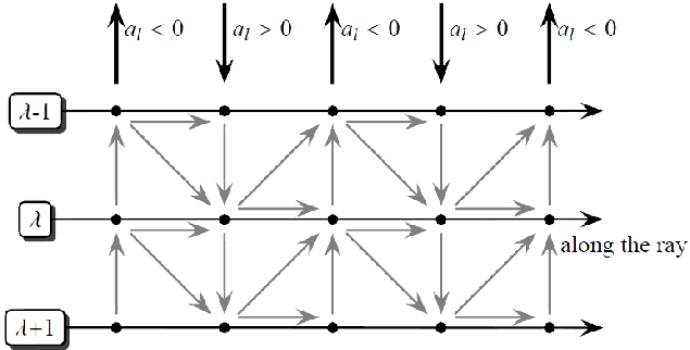 a formal solution of the radiative-transfer problem can be formulated. In our work, we use a characteristic method along different photon paths throughout the atmosphere. The spatial position of a characteristic is then discretised on a spatial grid. In the following, a pair of subscript indices indicate the position in both the spatial grid and the wavelength grid. Commonly the spatial grid is mapped onto an optical depth grid via the relation