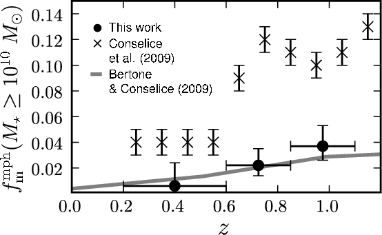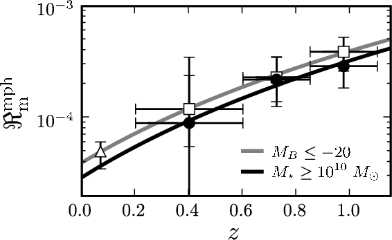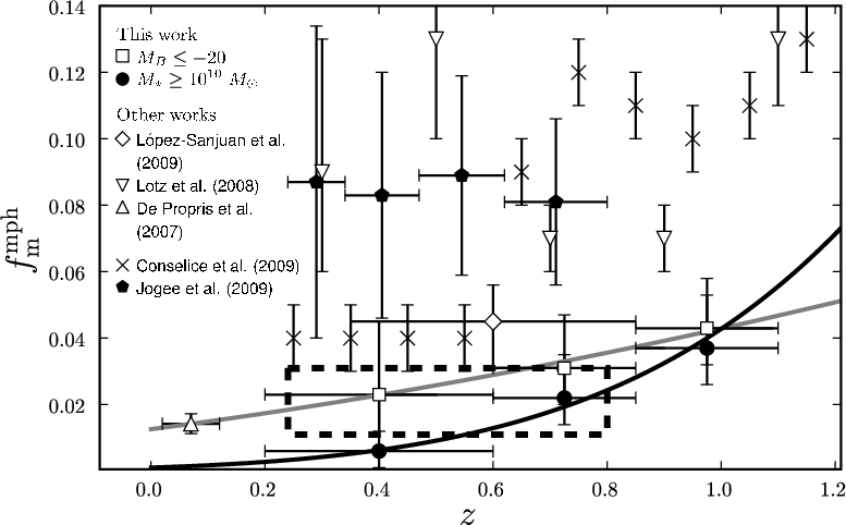 kinematic close companions (Bluck et al. 2009; De Propris et al. 2007; Patton et al. 2000; Lin et al. 2004,2008; Patton et al. 2002; De Propris et al. 2005; Patton & Atfield 2008), spatially close pairs (Bridge et al. 2007; Hsieh et al. 2008; Bundy et al. 2004; Le Fèvre et al. 2000; Bundy et al. 2009; Kartaltepe et al. 2007), or the correlation function (Bell et al. 2006b; Masjedi et al. 2006). In these studies the value of the merger index m at redshift