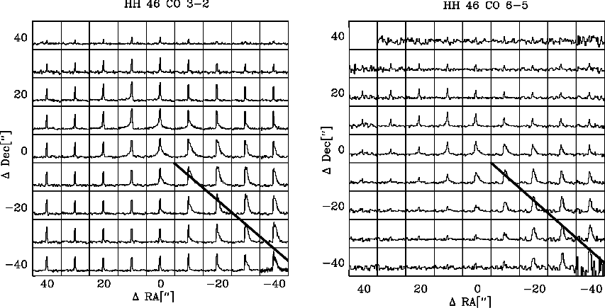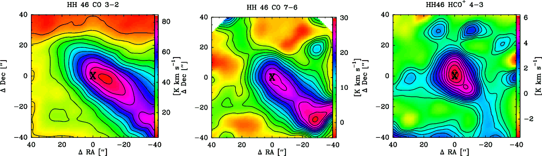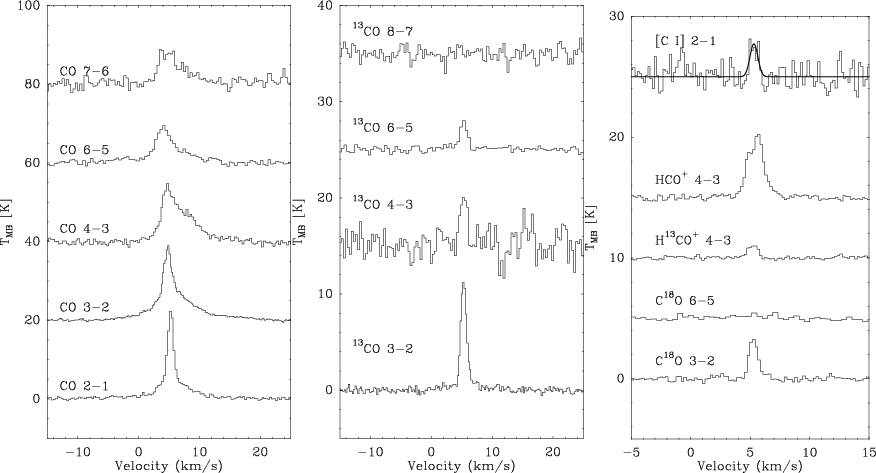 Figure 1: Single spectra taken at the central position of HH 46 (all in order from bottom to top). Left: 12CO 2-1, 12CO 3-2, 12CO 4-3, 12CO 6-5 and 12CO 7-6. Middle: 13CO 3-2, 13CO 4-3, 13CO 6-5 and 13CO 8-7. Right: C18O 3-2, C18O 6-5, H13CO+ 4-3, HCO+ 4-3 and [C I] 2-1. Spectra have been shifted vertically for easy viewing. |