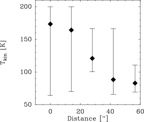 cm-3, but drop to 80 K further from the central source if densities and optical depth remain constant. However, the data are also consistent with a constant kinetic temperature in the covered area if densities decrease to a few 103 at a distance >40'' from the central source, as found for the surrounding cloud.