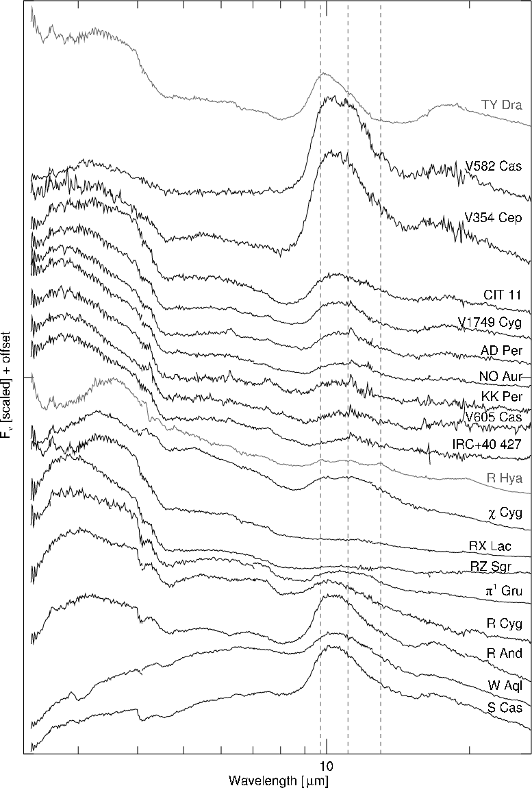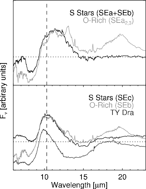 The most diagnostic feature in the S star spectra is found in the 10 m region. The dust emission features in the 10