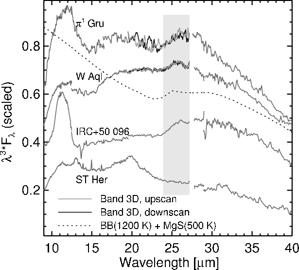 m feature attributed to MgS. Two sources exhibit a series of emission bands between 20 and 40