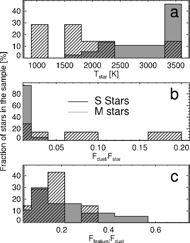 pronounced. In Fig. 7 we summarise the derived properties of the S stars compared to those of the M stars. The main conclusion is that the studied S stars as a sample are redder and exhibit a stronger excess than the O-rich stars with the broad 10