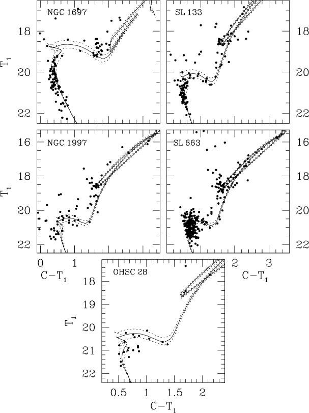 Results. With the exception of NGC 1697 (age = 0.7 Gyr, [Fe/H] = 0.0 dex), the remaining four clusters are of intermediate-age (from 2.2 to 3.0 Gyr) and relatively metal-poor ([Fe/H] = -0.7 dex). The cluster and field age-metallicty realtions show evidence for a metallicitybut do overlap, particularly on the upper envelope side of the cluster age-metallicity relation.