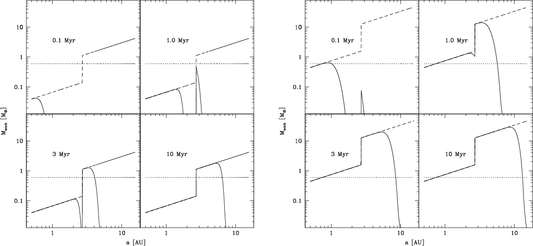 decreases with time, so that the minimal mass needed to open a gap decreases. This effect is emphasized by the fact that our disk model currently does not include irradiation, so that especially towards the end of disk evolution,