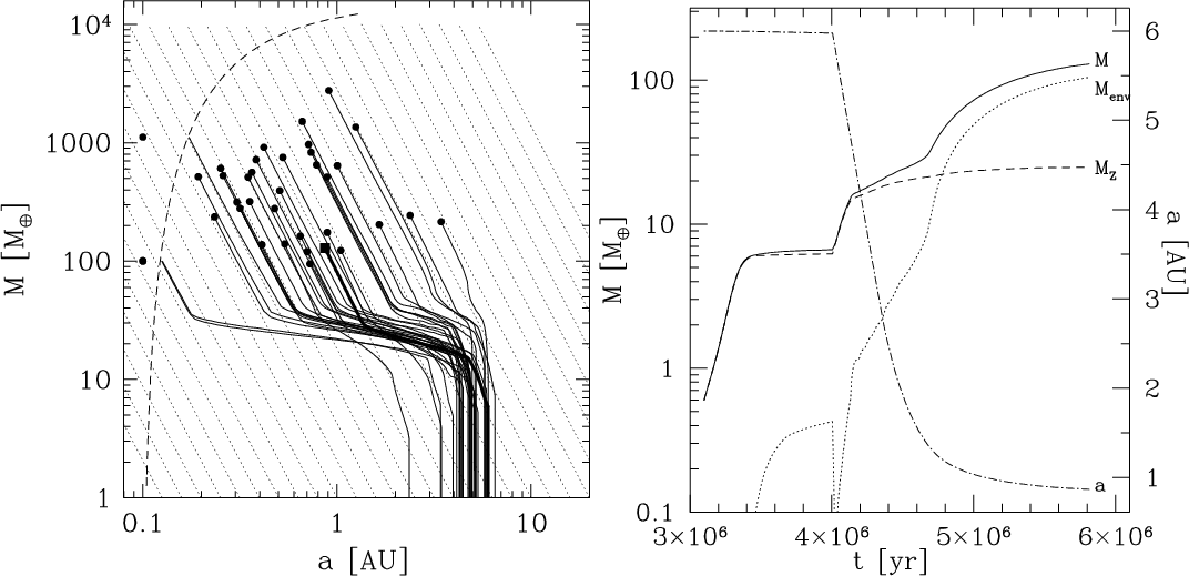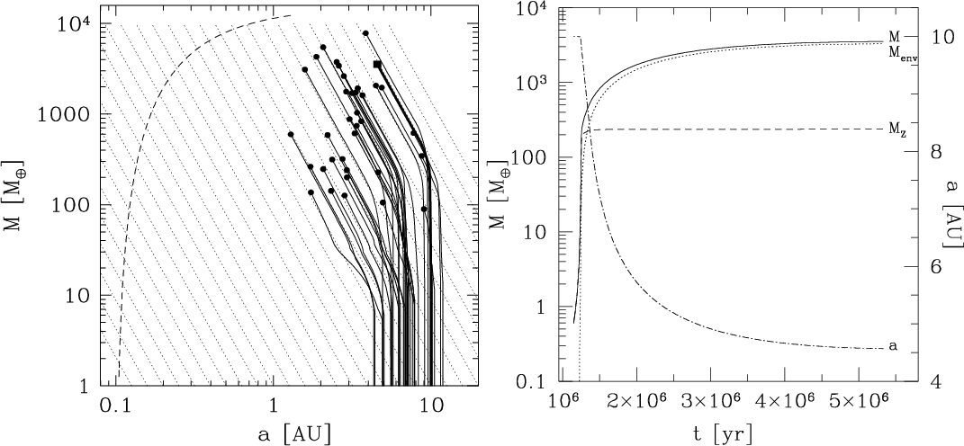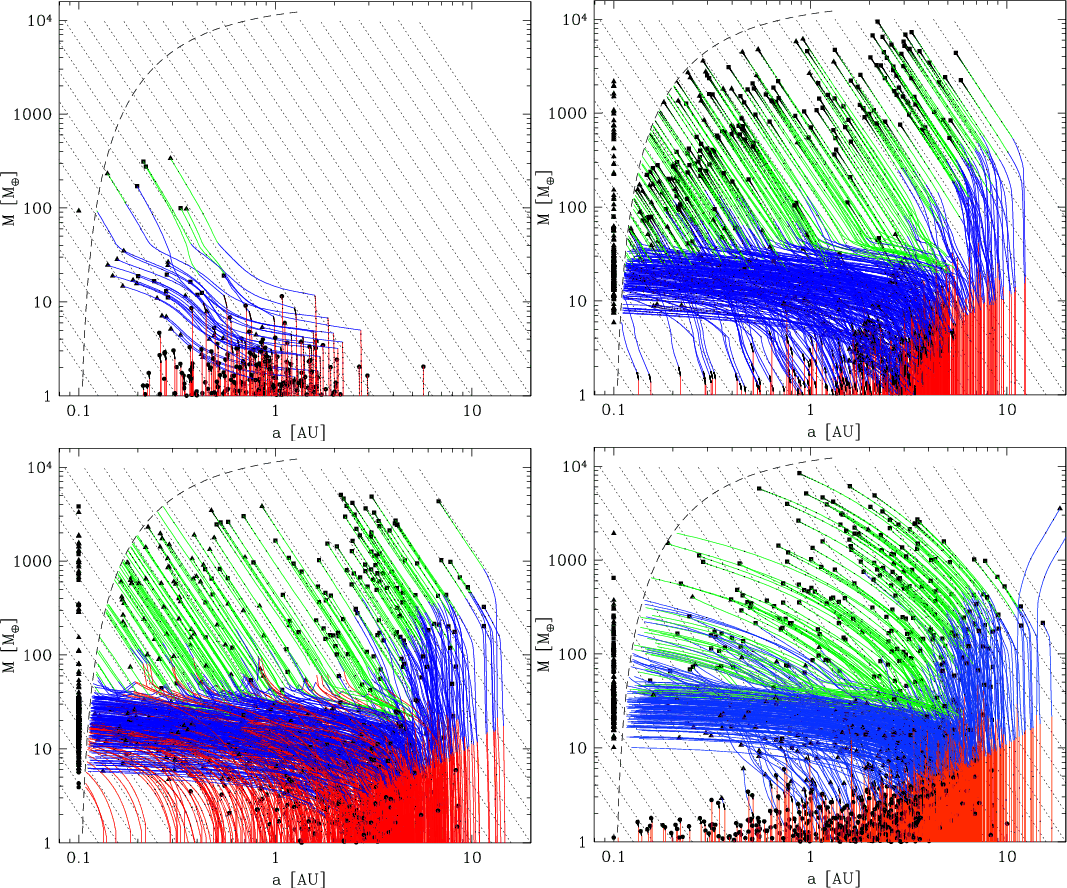 In our simulation, the transition typically occurs when the aspect ratio of the disk has become tiny, between 2 and 3%, meaning a transition at tens of Earth masses. We note that Crida et al. (2006) have derived a new criterion for gap opening which depends on both the disk aspect ratio and the Reynolds number. Using such a modified transition mass has some influence on the planetary formation tracks (see Sect. 5.3.5).