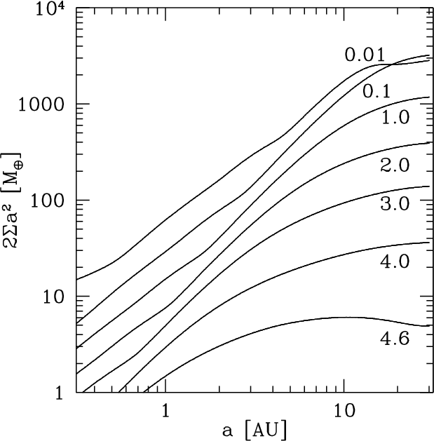 , using BL=4. However, as we do not reduce the initial solid surface density by the amount of material already in the initial seed, a value larger for the mass by about 3/2