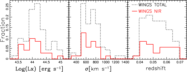 Figure 1: Distribution of WINGS-NIR clusters (red full line) compared with the distribution of all the WINGS survey clusters (black dotted line). The dotted diagram is slightly shifted for ease of view. |