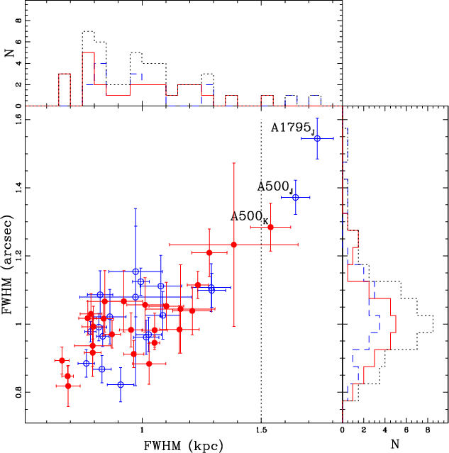 Figure 3: The distribution of the median FWHMs (angular vs. physical) of all the J- (open blue circle; blue dashed line) and K-band (filled red circles; red full line) mosaics: black dotted lines are the total J and K distributions. The error bars show the rms of the median seeing variation of each section of the mosaic, as shown in Fig. 4. Note that a large error bar means that, due to non-photometric nights and/or technical problems with the camera, the FWHM was unstable among the different exposures making up the final mosaic. The dotted vertical line is the limit for quality requirements of WINGS survey spatial physical resolution, needed for reliable morphological classification and surface photometry. |