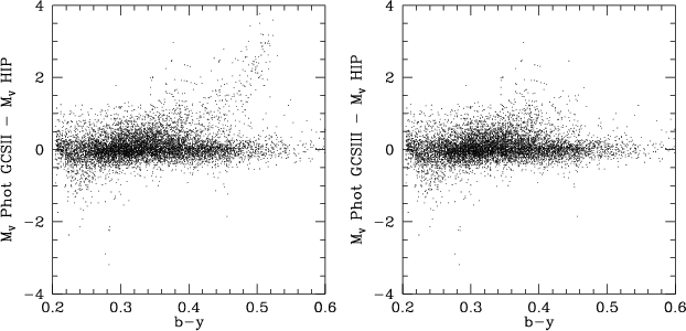 Figure 1: Differences between MV as determined from the uvby photometry with the GCS II calibration, and from the new Hipparcos parallaxes. Left: full GCS sample. Right: restricted colour range (see text). |