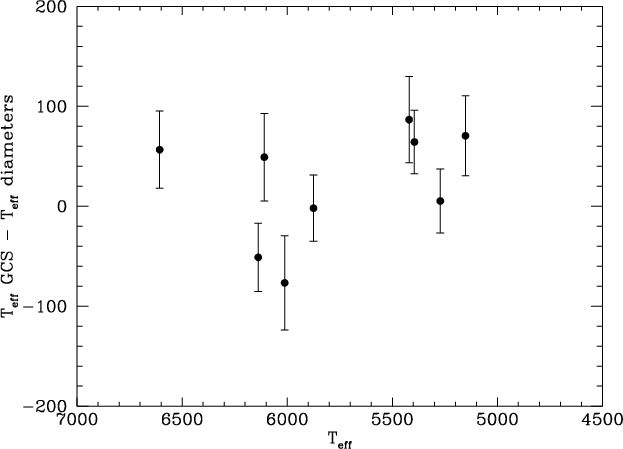 for 10 dwarfs and 2 sub-giants. We can now supplement the four high-accuracy measurements of their sample with four new diameters from the CHARA (Baines et al. 2008; Boyajian et al. 2008) and SUSI interferometers (North et al. 2007, 2009). This gives us a sample of nine stars with diameters accurate to 2% or better, and with good temperatures in GCS II as well. The mean difference is