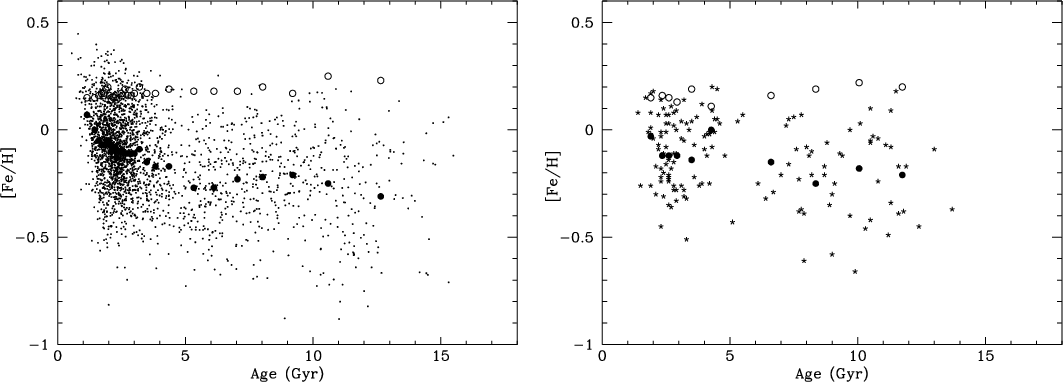 The relationship between age and metallicity for stars in the solar neighbourhood - the age-metallicity relation (AMR) - is probably the most popular diagnostic diagram for comparing galactic evolution models with the real Milky May. We show it with our new data in Fig. 4 (left) for the subsample of stars defined above.
