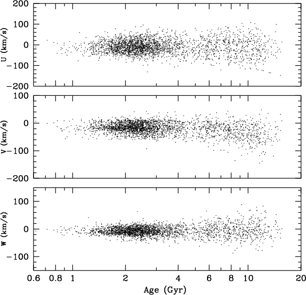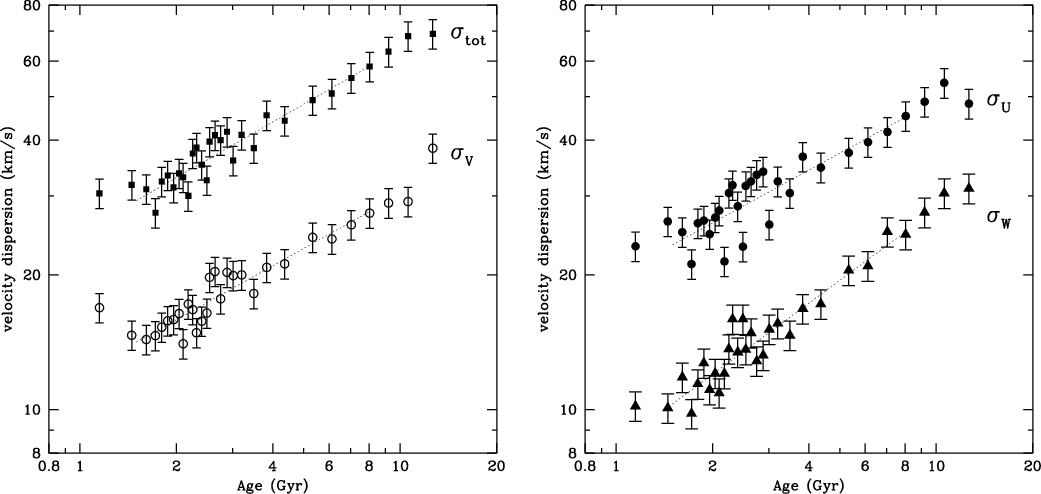 Figure 7 shows the resulting AVR for our observed sample of single stars, showing a smooth, general increase of the velocity dispersion with time in both U, V, and W. Fitting power laws while excluding the three youngest and three oldest bins, we find exponents of 0.39, 0.40, 0.53 and 0.40 for the U, V, W and total velocity dispersions - very similar to the values derived in GCS II.