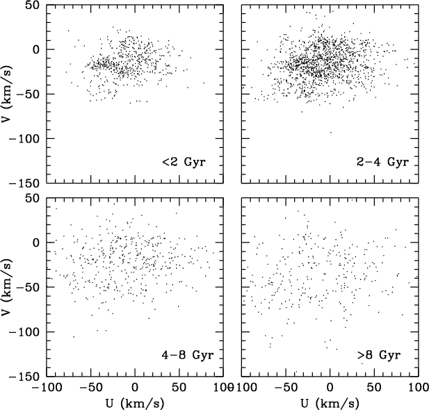 Figure 5 shows the observed space velocity components as functions of age for the subsample defined above, while Fig. 6 shows them in the U-V plane, separated into four age groups. Like Figs. 20 and 30 of the GCS, they illustrate the significant substructure in the U and V velocity distributions that persists over a wide range of ages (see GCS I, Famaey et al. 2005; Seabroke & Gilmore 2007; Bensby et al. 2007; and Antoja et al. 2008 for further discussion of these features). The revised velocity data do not significantly change the W velocity distributions shown in GCS II (Fig. 32).