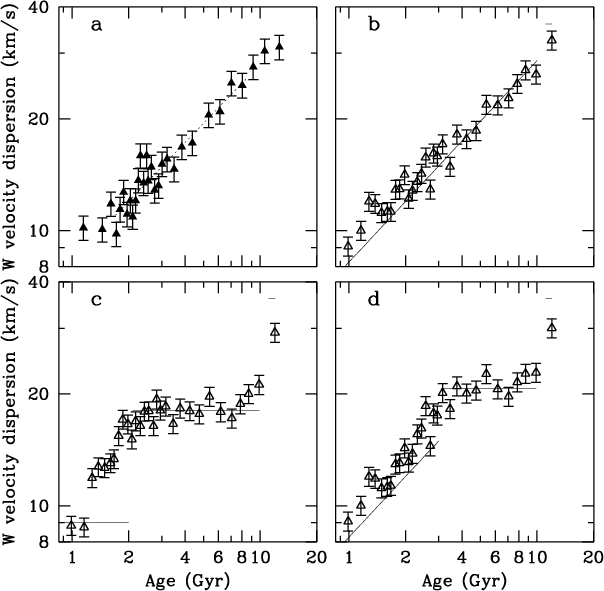 The first synthetic AVR (panel b) is a continuous rise in velocity dispersion over the whole lifetime of the thin disk. However, simulations (Hänninen & Flynn 2002) have shown that if only known local heating agents are assumed (i.e. GMCs), implausible amounts are needed to match the observed