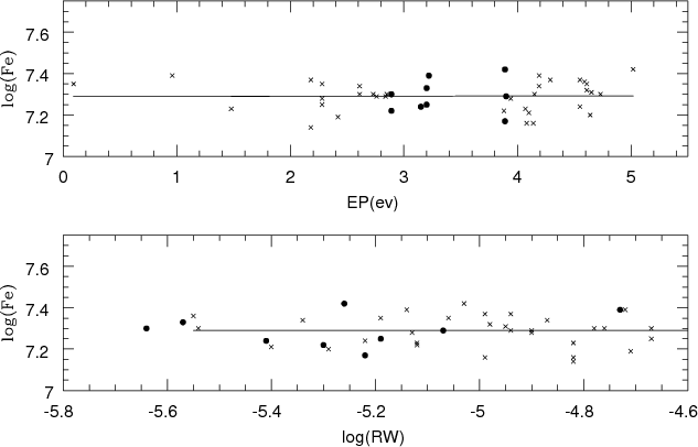 Individual line FeI (crosses) and FeII (filled circles) abundances as a function of the excitation potential ( top panel) and the reduced equivalent width, RW =
