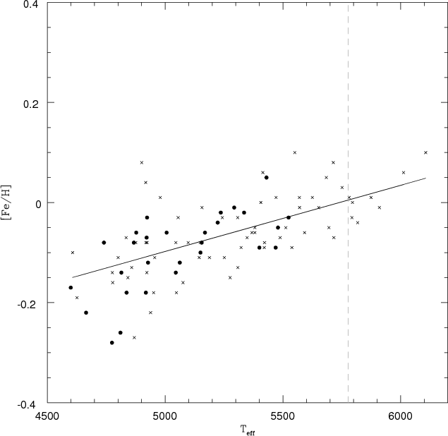 vs. [Fe/H] plot for the stars studied in this work (crosses) and that of SA08 (filled circles). The solid black line represents a simple least square fit of the initial values found. The slope of the line is of about 0.13 dex per 1000 K. The dashed vertical line represents the solar value used as a reference.
