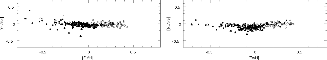 In addition to iron, abundances for Si and Ni were also derived. We refer the reader to Santos et al. (2006) and GI06 for a description of the procedures and atomic line-list used. Resulting abundances and errors for these elements are given in Table 5. Furthermore, abundance ratios [X/Fe] (with X = Ni and Si) were compared with those from GI06, who applied the same method, line list, and atmospheric models.