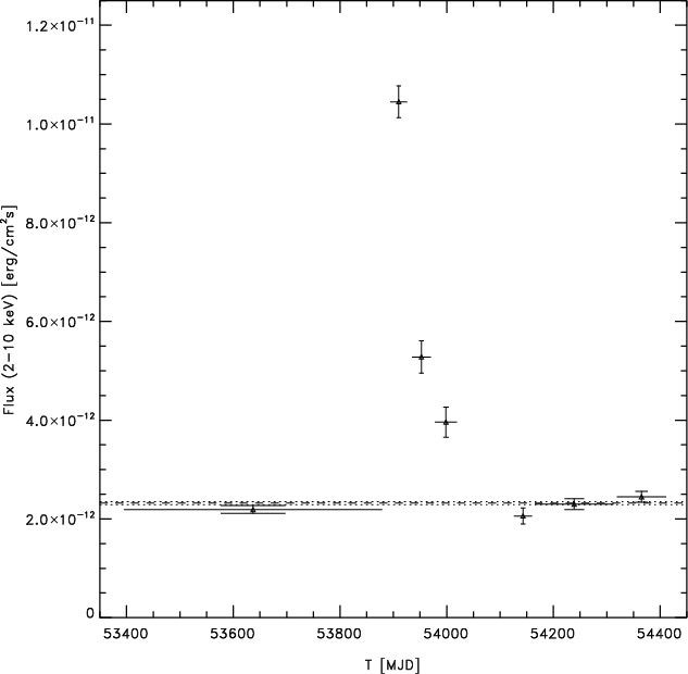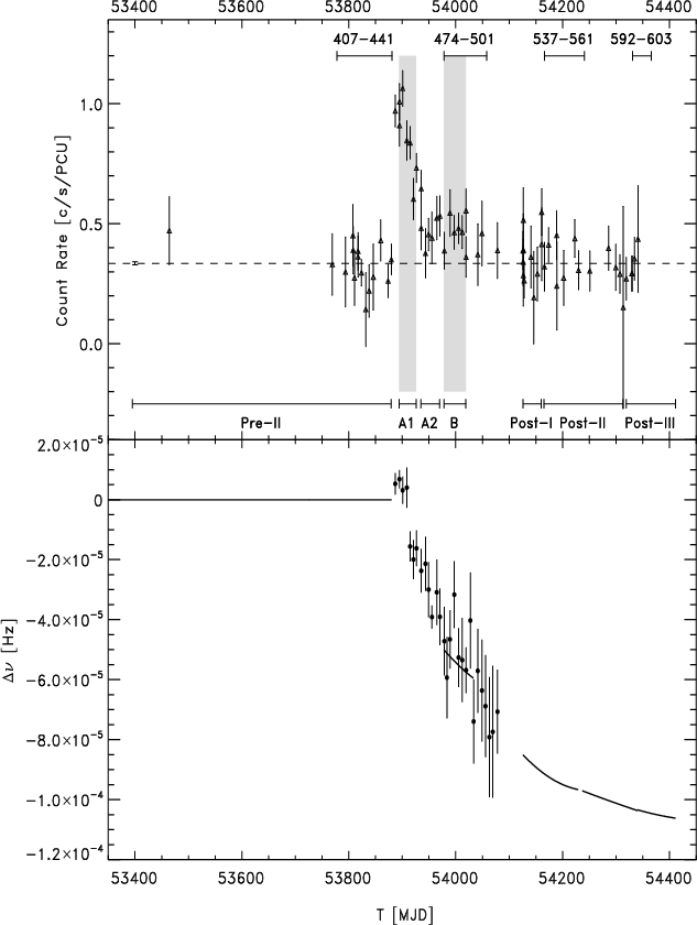 measured in 2000 to 1.97 during the outburst in 2006. Gavriil et al. (2008) used RXTE observations to show that this prompt radiative event exhibited a recovery from the pulsed-flux enhancement which can be modeled