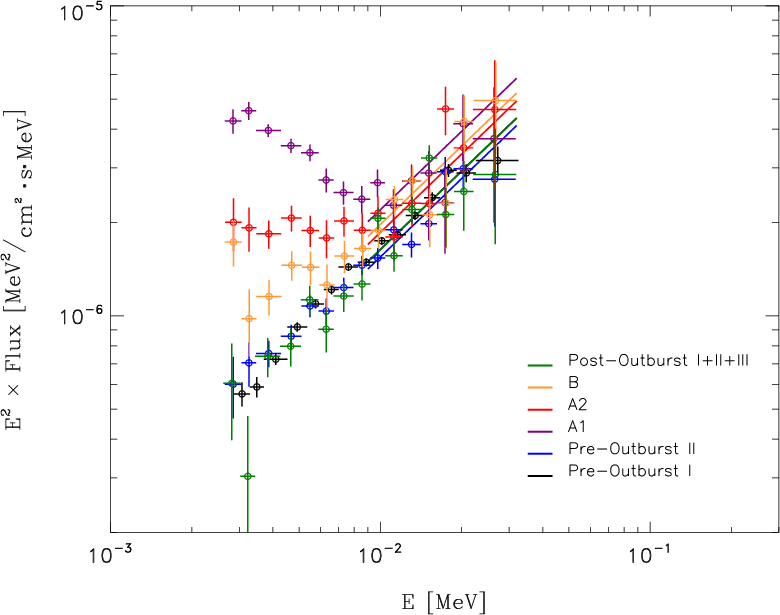 erg/cm2 s. More than 90 days after the onset of the outburst, still during the decay phase, the same spectral shape was measured (