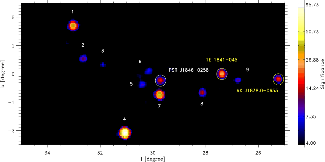 erg/s. It remains undetected at radio frequencies (Archibald et al. 2008). PSR J1846-0258 is located at the centre of supernova remnant (SNR) Kes 75 (G29.7-0.3, Kesteven 1968) and