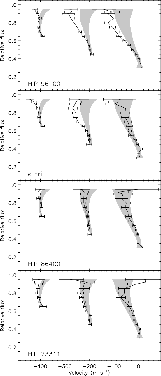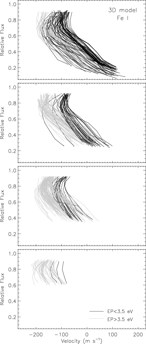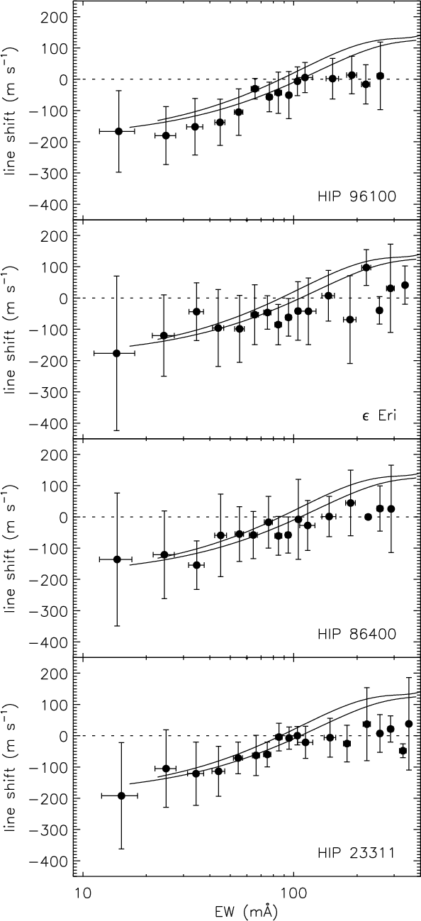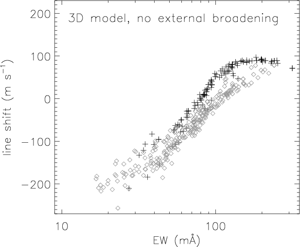 It should be emphasized that even though our 3D model represents significant progress relative to the 1D scenario, there is still room for improvement. For example, the simulation predicts convective redshifts of about 100 m s-1 for the strongest Fe I lines, but implications based on solar observations and their comparison to our K-dwarf data indicate that they should be nearly zero. Non-LTE effects, the chromosphere, or numerical artifacts associated with our 3D model calculations could be responsible for this discrepancy.