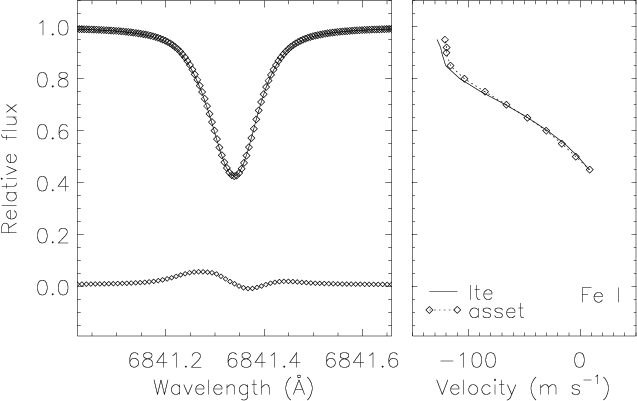 Left: Spectral lines synthesized with the 3D codes lte (solid line) and Ass |