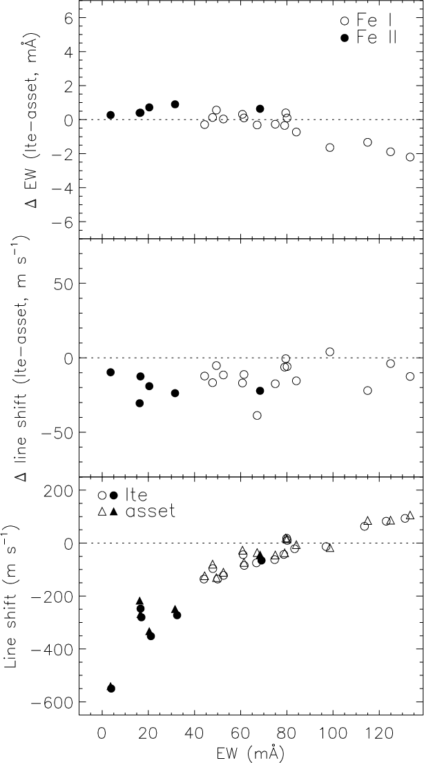 Difference in equivalent width ( top panel), line shift ( middle panel), and EW vs. line shift relation
