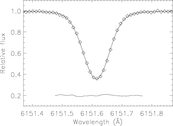 We selected 14 of the ``cleanest'' iron lines available in the HIP 86 400 spectrum and computed the difference between observed and predicted profiles around 0.15 Å from the line center using only two free parameters, the