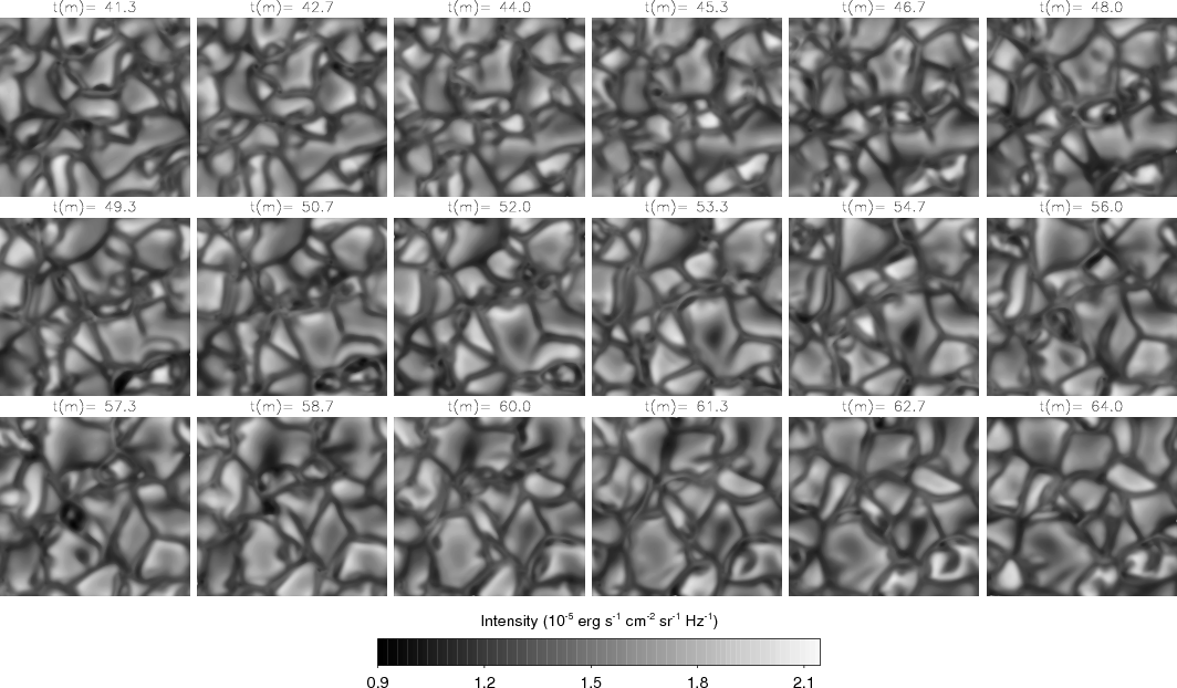 The time evolution of the emergent intensity that would be observed on the surface of this model star is illustrated in Fig. 1 (in Sect. 3 we provide details on the calculation of the emergent intensity from the 3D model). The pattern of granules and intergranular lanes resembles that of the Sun but on a smaller geometrical scale. The correlation between the emergent intensity of a given snapshot and those of the subsequent ones decreases smoothly and vanishes for images separated by about 10 min, a number comparable to that obtained for the solar simulation. Thus, the lifetime of granules in our K-dwarf simulation is similar to that of the Sun.