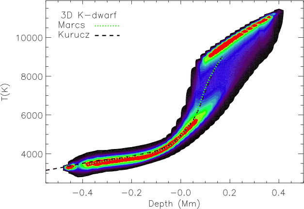 Figure 2: Temperature structure of our 3D K-dwarf model atmosphere near the visible surface (the full simulation extends much deeper than shown here). The color code represents the number of grid points at a given temperature and depth, with red being the largest and dark blue the lowest number. The dotted green line and dashed black line correspond to temperature structures of 1D model atmospheres (see legend on the top left). The depth scale is set to zero at the geometrical plane where the mean Rosseland optical depth is equal to 1; i.e., at the ``visible'' surface. |