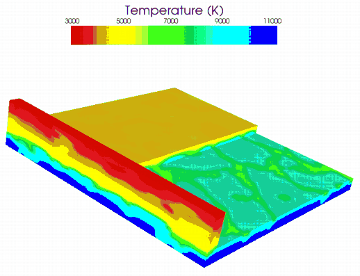 A snapshot of the temperature structure of our 3D model is shown in Fig. 3. Clearly, the strongest temperature contrasts occur well below the visible surface. This phenomenon was referred to as ``hidden'' granulation by Nordlund & Dravins (1990) in their study of a granulation model for Cen B (spectral type K1V) but note that the intensity fluctuations are still clearly visible on the surface of this cool star model, as illustrated by our Fig. 1.