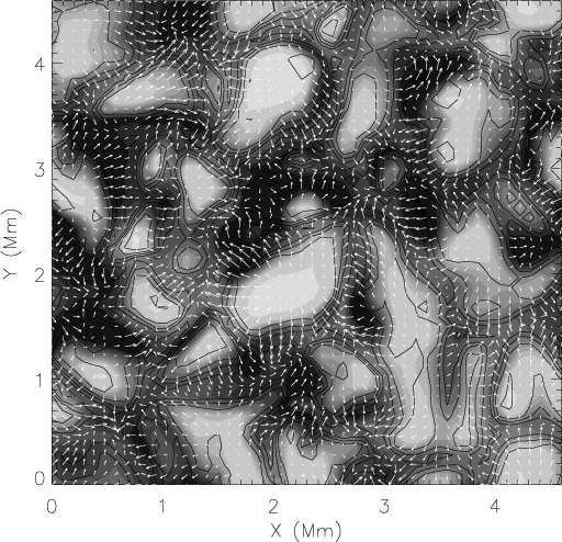 Figure 4: Temperature and velocity fields of a snapshot of our 3D K-dwarf model atmosphere at the geometrical depth corresponding to 50 km below the visible surface. The velocity field is superimposed on the temperature field and is represented with solid lines (contours tracking the vertical component) and arrows (horizontal component). In this snapshot, the temperature extremes differ by about 2500 K (cf. Fig. 2) while the vertical velocities range from about -4 to +4 km s-1 and the horizontal component from 0 to 5.6 km s-1 with a mean value of 2.1 km s-1. |