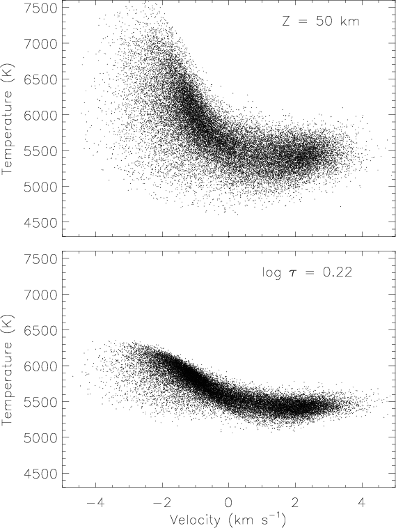 Top panel: correlation between temperature and vertical velocity of the 3D K-dwarf model atmosphere at the geometrical depth corresponding to 50 km below the visible surface, where the average optical depth is