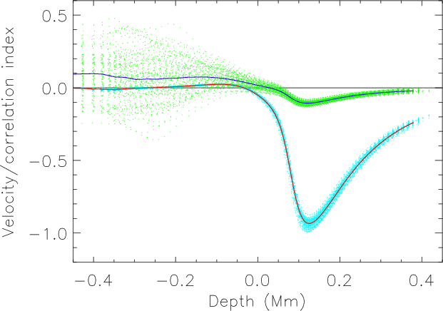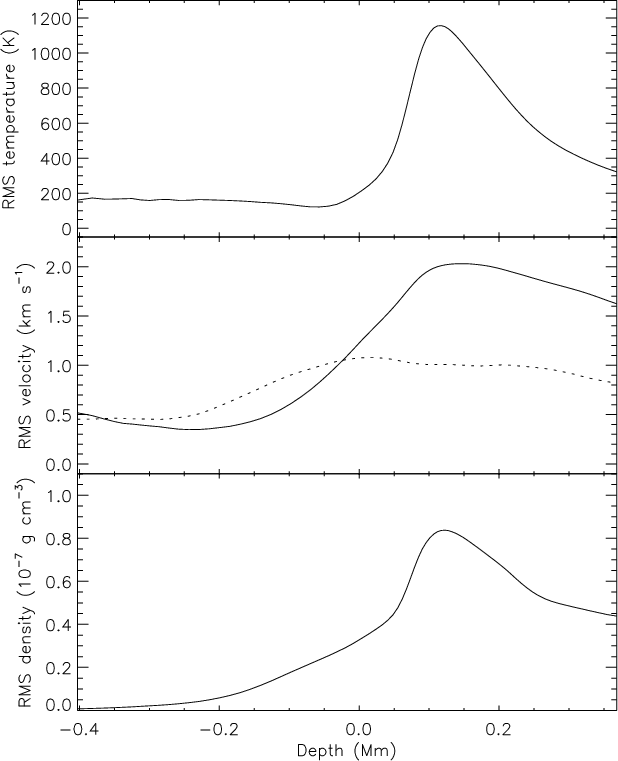 The fluctuations of the temperature, velocity, and density fields in the 3D simulation as a function of depth are quantified by their root mean square (rms) values. The maximum rms values of all these parameters occur at a depth of about +0.1 Mm (Fig. 6). In this layer, the rms values are about 1200 K, 2 km s-1 (vertical component only), and