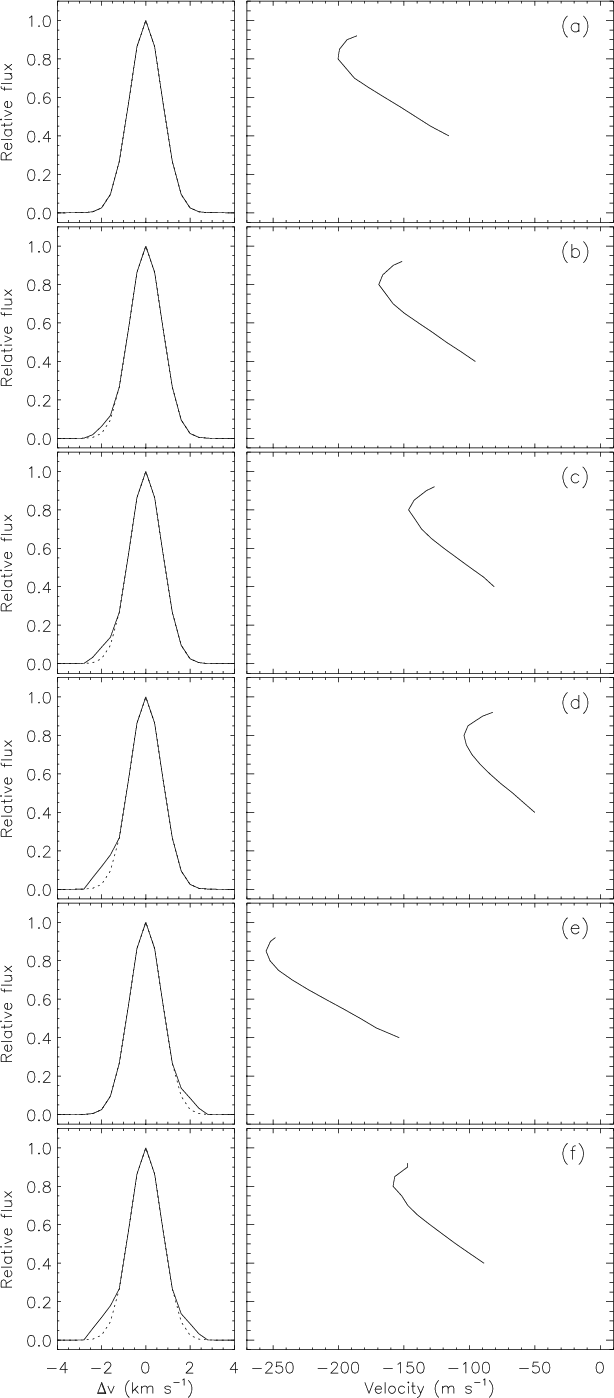 In general, the wings of line profiles computed with lte are slightly deeper, in particular the blue wing. This makes the line bisector span slightly larger, by less than about 10 m s-1 for the example shown in Fig. A.1. This also leads to a slightly higher (more negative) convective blueshift for the lte case, as shown in the middle panel of Fig. A.2. The line core blueshift is higher (more negative, by about 15 m s-1) according to lte.