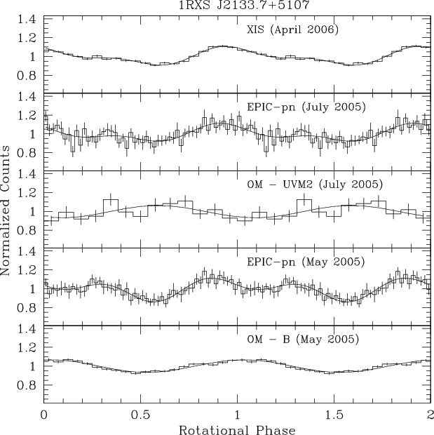 RX J2133 was observed on May 29, 2005 (OBSID: 0302100101) with all the EPIC cameras operated in full frame mode and with the medium filter. Due to high background radiation the observation time was shortened and the net exposure times were 13.6 ks for EPIC-pn, 16.5 ks for EPIC-MOS and 13.9 ks for RGS, the latter operated in spectroscopy mode. The OM, operated in fast imaging mode, was used sequentially with the B filter, covering the spectral range 3900-4900 Å, and the UVM2 filter for 11.6 ks each. RX J2133 was observed again on July 06, 2005 (OBSID: 0302100301) with the same instrumental configurations and with net exposure times of 9.9 ks for EPIC-pn, 13.7 ks for EPIC-MOS and 13.9 ks for RGS. The OM was only operated with the UVM2 filter for a total exposure time of 8.4 ks. The source was found at about the same count rate at the two epochs in all instruments.