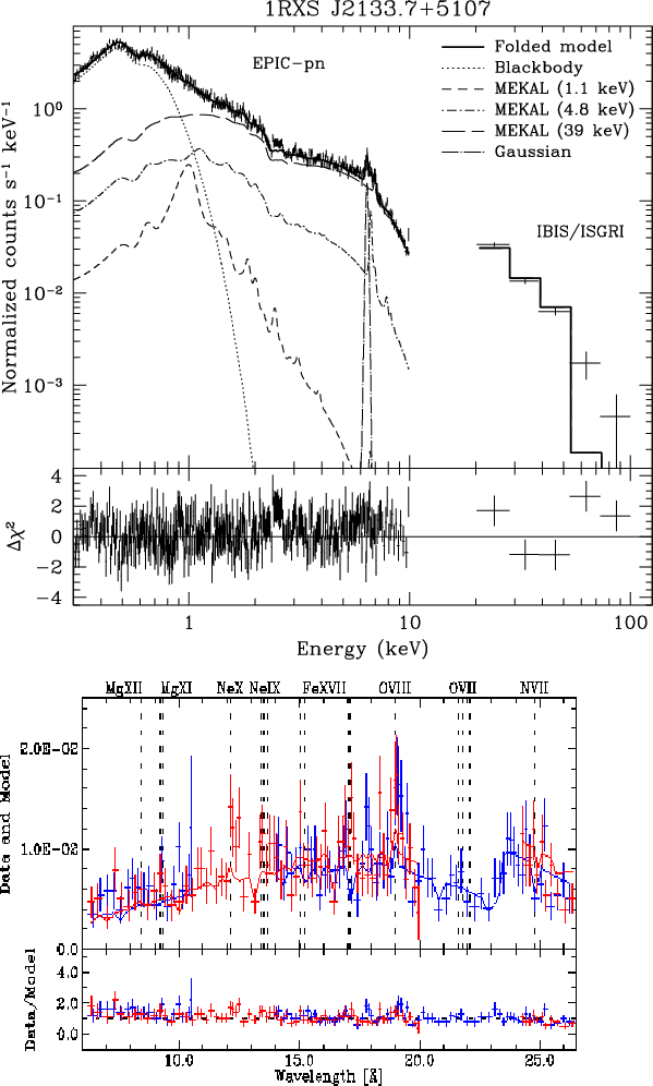 keV. In 1RXS J213344.1+510725, multiple optically thin components are inferred, as well as an optically thick (blackbody) soft X-ray emission with a temperature of