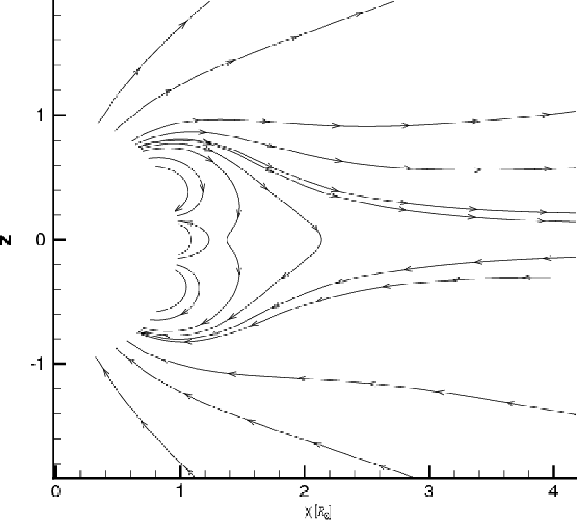 The initial condition is the converged hydrodynamic solar wind solution of Parker (1958) combined with a dipole field of field strength 2.2 G at the poles. An extra vector potential,