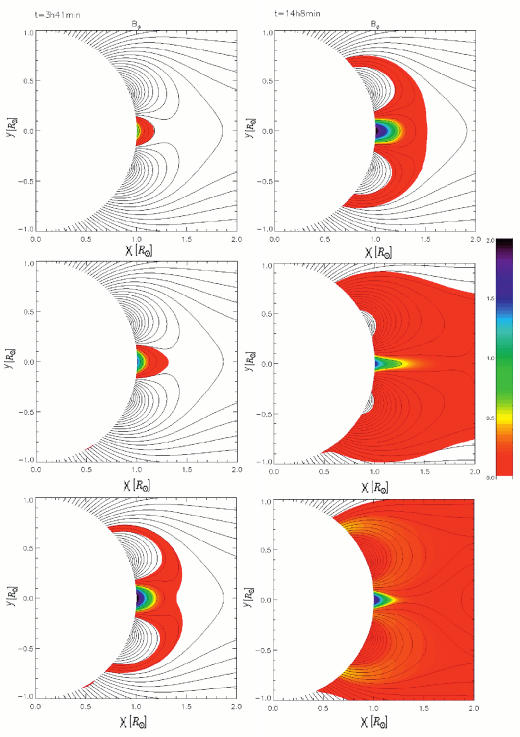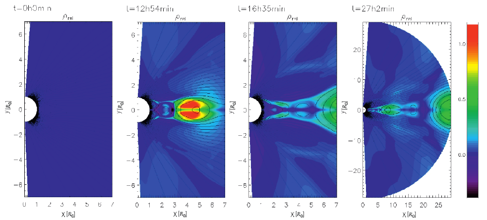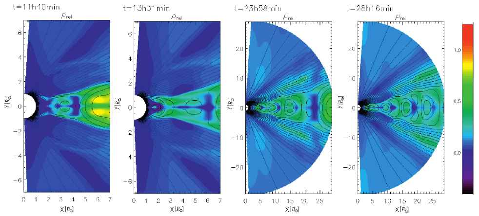 Finally, at t = 27h2min we can see the different eruptions. At the edge of our computational domain we have the first two flux ropes, who have merged at this point, followed by the third flux rope. Closer to the Sun we can also see that a second eruption has occured producing two more flux ropes similar to those produced by the initial eruption. The density (with respect to the original solar wind density in that region) is lower for the second eruption. Its structure is similar to the initial one because the central arcade and part of the overlying field were able to recover to their original topology before the central arcade started to rise again. At this point we would like to stress that the actual CME is the ejection of the helmet streamer, as is the case in van der Holst et al. (2007), and not the expanding central arcade. This point in our simulation coincides with the latter stages of van der Holst et al. (2007) around time 23 h, i.e. when the system relaxes to its quadrupolar configuration with overlying field.